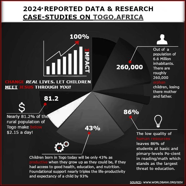 Nearly 81.2 percent of Togo's rural population lives under the global poverty line. 260,000 children in Togo have lost either one or both their parents. Thousands more throughout all regions of the country are at risk of losing parental care due to socioeconomic related issues. 50 percent of those impoverished children are under 18 years of age.